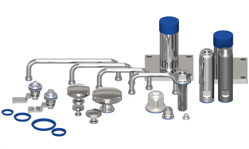 Cette gamme de pieds, supports inox hygiéniques à semelle EPDM est complétée par des accessoires de conception hygiéniques dotés de joints silicone bleus garantissant l’étanchéité des assemblages.